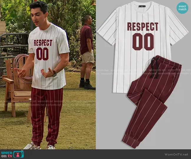 Parker Preston (played by Trevor Tordjman) on Bunkd on Disney was spotted wearing this Respect striped tee and pants on Bunkd on episode 'Where the Buffalo Betties Roam' (6x06) in Jul 2022. Parker's Set is the Multicolor Letter Graphic Striped Tee and Pants Set by OLRIK Clothing.