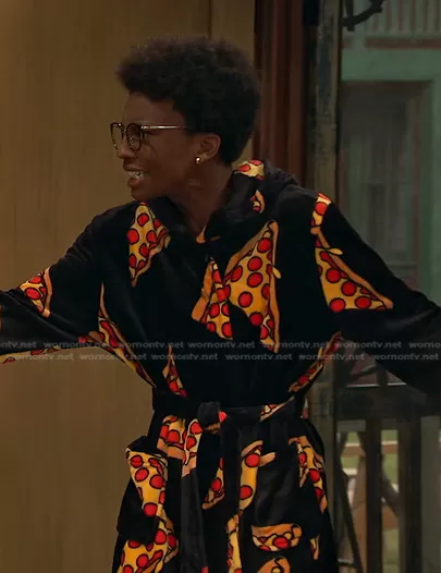 Noah Lambert (played by Israel Johnson) on Bunkd on Disney was spotted wearing this black pizza print fleece robe on Bunkd on episode 'Where the Buffalo Betties Roam' (6x06) in Jul 2022.