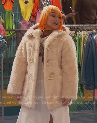 Raven Baxter (played by Raven-Symoné) on Ravens Home on Disney was spotted wearing this white fur coat on Ravens Home on episode 'The Grand Booker-Pest Hotel' (5x16) in Jul 2022. Raven's Coat is the Winston Faux Fur Coat by A.L.C..