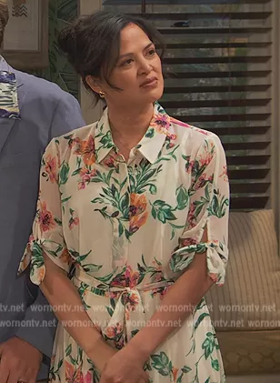 (played by ) on Ravens Home on Disney was spotted wearing this white floral print shirtdress on Ravens Home on episode 'The Grand Booker-Pest Hotel' (5x16) in Jul 2022. 's Dress is the Floral-Print Tie-Sleeve Shirtdress by Calvin Klein.