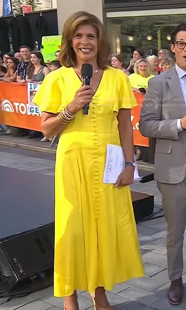 Hoda Kotb on Today on NBC was spotted wearing this yellow button front flutter sleeve dress on Today on Jun 26 2023's episode. Hoda's Dress is the Linen Flutter Sleeve Midi Dress by Pearl by Lela Rose . Hoda's Bracelet is the 5 Row Textured Gold Cuff Bracelet by Jennifer Miller.