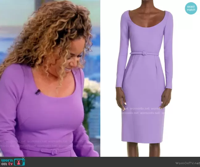 Sunny Hostin on The View on ABC was spotted wearing this purple belted dress on The View on Jul 20 2022's episode. Sunny's Dress is the Scoop Neck Belted Long Sleeve Stretch Wool Blend Dress by Oscar de la Renta.