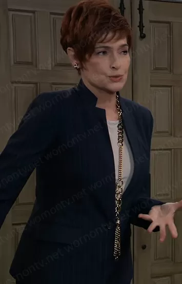 Diane Miller (played by Carolyn Hennesy) on General Hospital on ABC was spotted wearing this navy pinstripe blazer on General Hospital on Jul 21 2022's episode. Diane's Blazer is the Pinstripe Lightweight Wool Blazer by Banana Republic.