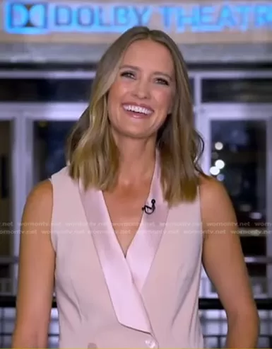on Good Morning America on ABC was spotted wearing this pink sleeveless tuxedo romper on Good Morning America on Jul 21 2022's episode. 's Romper is the Georgia Tuxedo Front Playsuit by Reiss.