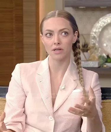 on Live with Kelly and Mark on Disney ABC Home Entertainment was spotted wearing this pink mixed stripe blazer on Live with Kelly and Ryan on Jul 22 2022's episode. 's Jacket is the Mixed Weave Wool Sport Blazer by Thom Browne.