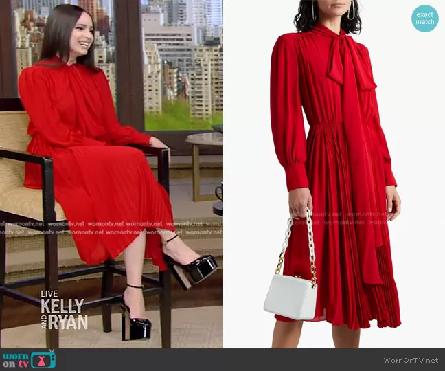 on Live with Kelly and Mark on Disney ABC Home Entertainment was spotted wearing this red tie neck pleated dress on Live with Kelly and Ryan on Jul 25 2022's episode. 's Dress is the Pussy-Bow Pleated Silk Dress by Valentino . 's Shoes is the Tan-Go Platform Sandals by Valentino.