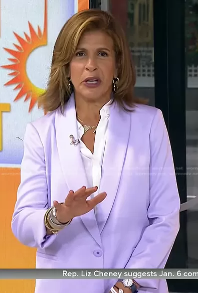 Hoda Kotb on Today on NBC was spotted wearing this lilac shawl collar blazer on Today on Aug 31 2022's episode. Hoda's Jacket is the Yuriko Shawl Collar Blazer by Alice + Olivia.