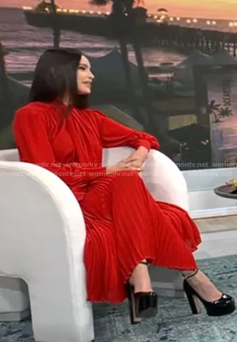 on CBS Mornings on CBS was spotted wearing this red pleated dress and black patent platforms on CBS Mornings on Jul 25 2022's episode. 's Dress is the Pussy-bow pleated silk crepe de chine dress by Valentino . 's Shoes is the Patent Leather Platform Pumps by Valentino.