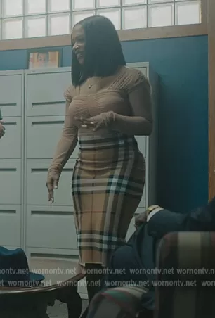 (played by Kandi Burruss) on The Chi on ShowTime was spotted wearing this tulle top and plaid skirt on The Chi on episode 'We Don't Have to Take Our Clothes Off' (5x05) in Jul 2022. 's Top is the Jackie Tulle Top by A.L.C. . 's Skirt is the Kammie Check Jacquard Tube Skirt by Burberry.