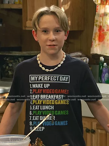 Jake (played by Luke Busey) on Bunkd on Disney was spotted wearing this My Perfect Day print tee on Bunkd on episode 'A Recipe for Disaster' (6x07) in Jul 2022.