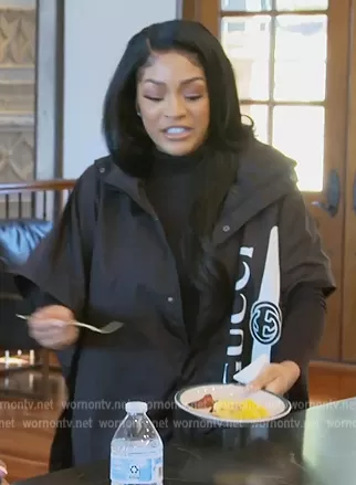 Drew Sidora on The Real Housewives of Atlanta on Bravo was spotted wearing this black Gucci rain jacket on The Real Housewives of Atlanta on episode 'Cabin Fever' (14x11) in Jul 2022. Drew's Jacket is the Logo Print Hooded Cape Poncho by Gucci.