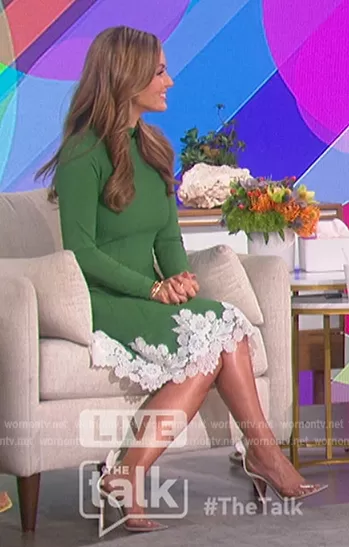 on The Talk on CBS was spotted wearing this green lace trim hem dress on The Talk on Jul 26 2022's episode. 's Dress is the Lace Hem Rib-Knit Dress by Lela Rose.