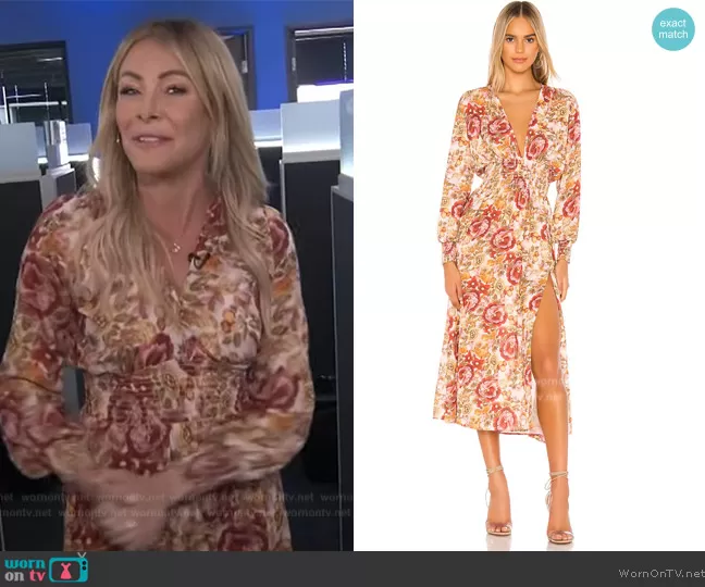 on Extra on Extra was spotted wearing this floral print midi dress on Extra on Jul 20 2022's episode. 's Dress is the Jade Dress by Resa.