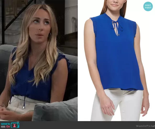Josslyn Jacks (played by Eden McCoy) on General Hospital on ABC was spotted wearing this blue tie neck top on General Hospital on Jul 27 2022's episode. Josslyn's Top is the Sleeveless Ruffle Trim Tie Neck Blouse by Calvin Klein.