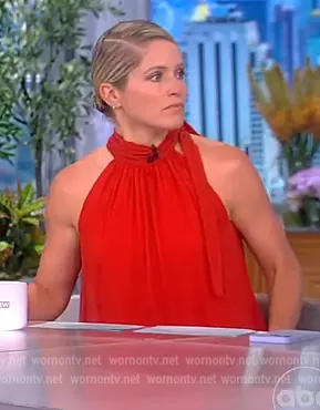 Sara Haines on The View on ABC was spotted wearing this red silk halter neck top on The View on Jul 28 2022's episode. Sara's Top is the Halter Bow Silk Top by Theory.