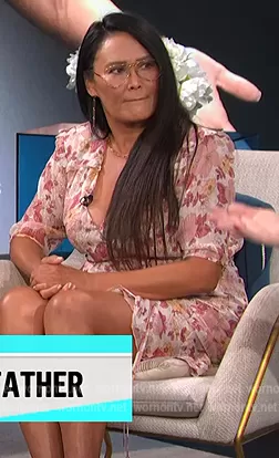 on E! News on E! was spotted wearing this pink floral dress on E! News Daily Pop on Jul 28 2022's episode. 's Dress is the Floral Wrap Dress by Veronica Beard.