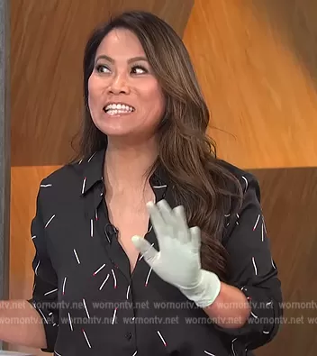 on E! News on E! was spotted wearing this black matchstick print blouse on E! News Daily Pop on Jul 28 2022's episode. 's Top is the Essential Blouse by Equipment.