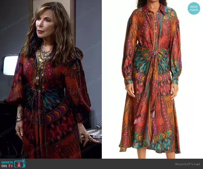 Kate Roberts (played by Lauren Koslow) on Days of our Lives on Peacock was spotted wearing this printed tie waist shirtdress on Days of our Lives on Jul 29 2022's episode. Kate's Dress is the Yawanawa Stripe Long Sleeve Shirt Dress by Farm Rio.