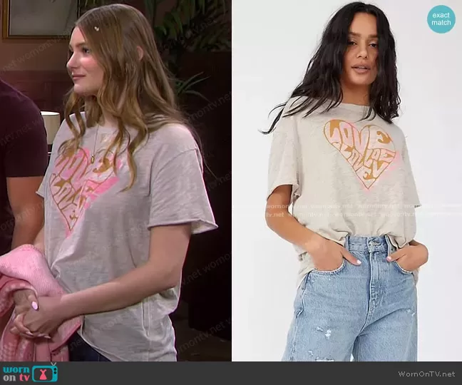 Alice Caroline Horton (played by Lindsay Arnold) on Days of our Lives on Peacock was spotted wearing this love heart print tee on Days of our Lives on Jul 29 2022's episode. Allie's Top is the Layered Love Tee by We The Free.