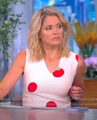 Sara Haines on The View on ABC was spotted wearing this white polka dot print dress on The View on Jul 29 2022's episode. Sara's Dress is the Silk Shift Dress by Akris Punto.