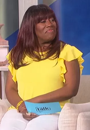 Sheryl Underwood on The Talk on CBS was spotted wearing this yellow ruffle top on The Talk on Jul 29 2022's episode. Sheryl's Top is the Ruffled Cap Sleeve Top by DKNY.