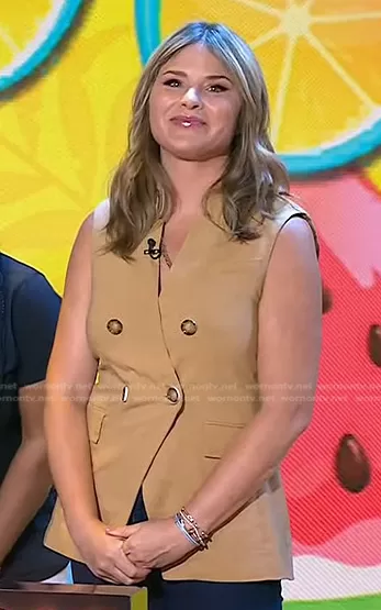 Jenna Bush Hager on Today on NBC was spotted wearing this beige double breasted vest on Today on Jul 29 2022's episode. Jenna's Vest is the Amika Double Breasted Linen Blend Vest by Veronica Beard.