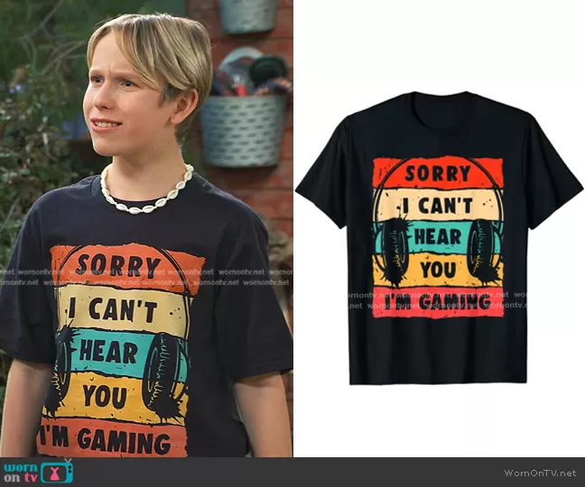 Jake (played by Luke Busey) on Bunkd on Disney was spotted wearing this Sorry I Can’t Hear You I’m Gaming tee on Bunkd on episode 'Back in the Saddle' (6x08) in Aug 2022.