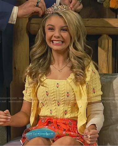 Destiny Baker (played by Mallory James Mahoney) on Bunkd on Disney was spotted wearing this yellow cable knit top and cardigan on Bunkd on episode 'Back in the Saddle' (6x08) in Aug 2022. Destiny's Top is the Flowers Knitted Cropped Top by Mango . Destiny's Sweater is the Flowers Knit Cardigan by Mango.