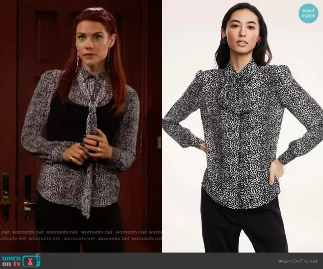 Sally Spectra (played by Courtney Hope) on The Young and the Restless on CBS was spotted wearing this animal print blouse on The Young and the Restless on Aug 02 2022's episode. Sally's Top is the Crepe Neutral Print Bow Blouse by Brooks Brothers . Sally's Pants is the Faux Leather Side Stripe Ponte Legging by Karen Millen.