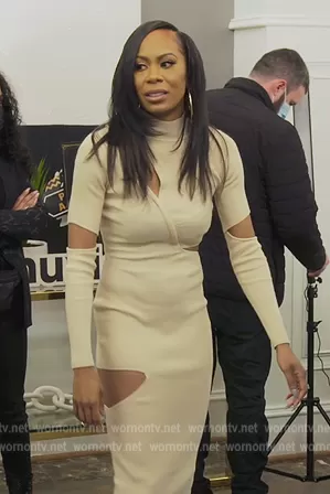 Sanya Richards-Ross on The Real Housewives of Atlanta on Bravo was spotted wearing this white cutout ribbed dress on The Real Housewives of Atlanta on episode 'Trust (Planning) Issues' (14x12) in Aug 2022. Sanya's Dress is the x REVOLVE Mel Cut Out Midi Dress by Michael Costello.