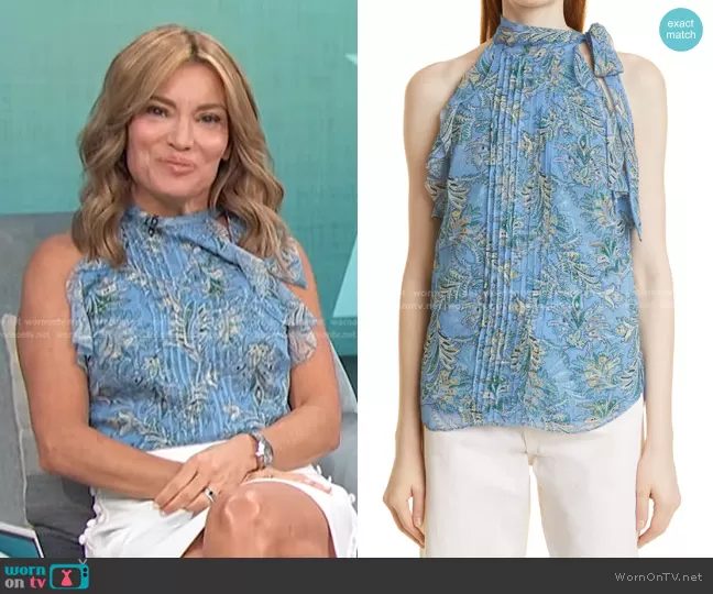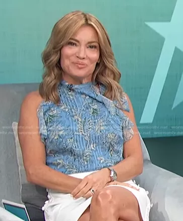 Kit Hoover on Access Hollywood on NBC was spotted wearing this blue printed tie neck top on Access Hollywood on Aug 02 2022's episode. Kit's Top is the Dali Floral Tie Neck Silk Blouse by Veronica Beard . Kit's Skirt is the Buttoned Satin Effect Skirt by Zara.