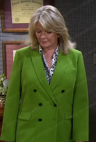Marlena Evans (played by Deidre Hall) on Days of our Lives on Peacock was spotted wearing this green double breasted blazer on Days of our Lives on Aug 03 2022's episode. Marlena's Jacket is the Tailored Blazer with Buttons by Zara.