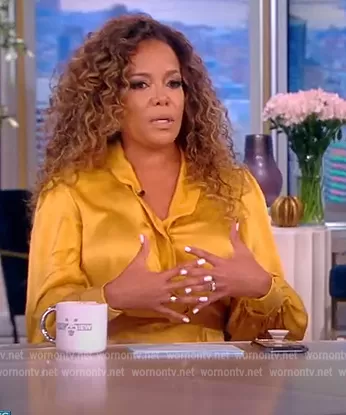 Sunny Hostin on The View on ABC was spotted wearing this gold satin wrap dress on The View on Aug 03 2022's episode. Sunny's Dress is the Long Sleeve Silk Wrap Dress by Zimmermann.