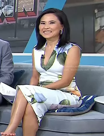 Vicky Nguyen on Today on NBC was spotted wearing this white floral v-neck sheath dress on Today on Aug 03 2022's episode. Vicky's Dress is the Rose Ravina Midi Dress by Ted Baker.