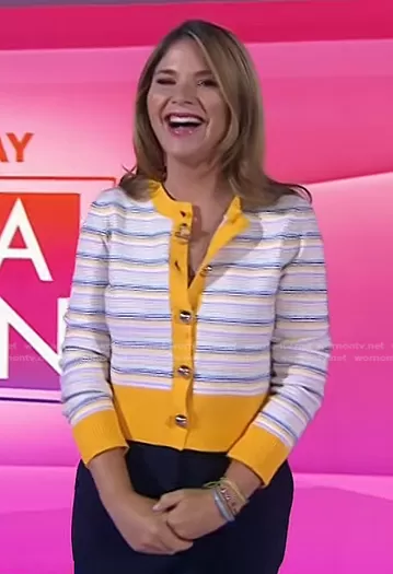 Jenna Bush Hager on Today on NBC was spotted wearing this yellow and white striped cardigan on Today on Sep 05 2022's episode. Jenna's Sweater is the Striped Tweed Cardigan by Milly.
