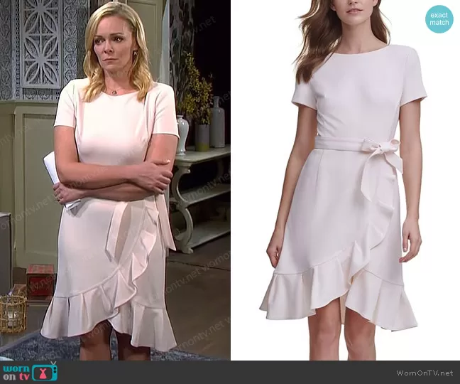 Belle Brady (played by Martha Madison) on Days of our Lives on Peacock was spotted wearing this blush pink ruffle hem dress on Days of our Lives on Aug 04 2022's episode. Belle's Dress is the Ruffled Tulip-Hem Crepe Dress in Blossom by Calvin Klein.