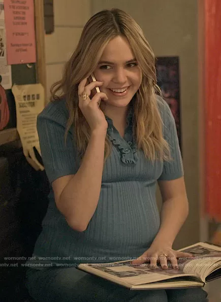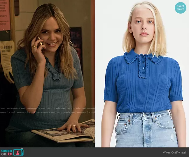 Imogen Adams (played by Bailee Madison) on Pretty Little Liars Original Sin on HBO was spotted wearing this blue ruffle trim polo top on Pretty Little Liars Original Sin on episode 'Chapter Four: The Fe(male) Gaze' (1x04) in Aug 2022. Imogen's Top is the Short Sleeve Polo Sweater by Levis.