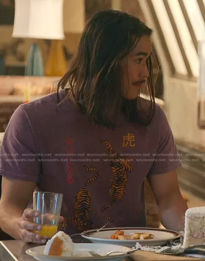Luca (played by Booboo Stewart) on Good Trouble on Freeform was spotted wearing this purple tiger print tee on Good Trouble on episode 'Life is What Happens' (4x14) in Aug 2022. 's Shirt is the Overdyed Tiger Short Sleeve Tee by Urban Outfitters.