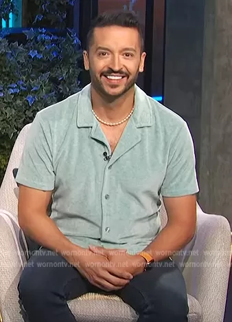 on E! News on E! was spotted wearing this sage shirt on E! News Daily Pop on Aug 05 2022's episode. 's Shirt is the Johnson Velour Cuban Shirt by Reiss.