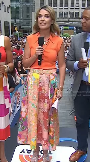 Savannah Guthrie on Today on NBC was spotted wearing this orange polo top and floral belted skirt on Today on Jun 15 2023's episode. Savannah's Top is the Taylor Rib Knit Polo Top by A.L.C. . Savannah's Skirt is the Lola Belted Paneled Floral-Print Linen Midi Skirt by Zimmermann . Savannah's Shoes is the Slide Sandal With Horsebit by Gucci.