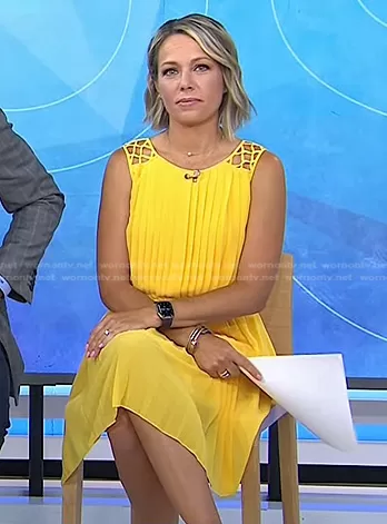 Dylan Dreyer on Today on NBC was spotted wearing this yellow pleated dress on Today on Jul 18 2024's episode. Dylan's Dress is the Sleeveless Pleated Dress by Jessica Simpson.