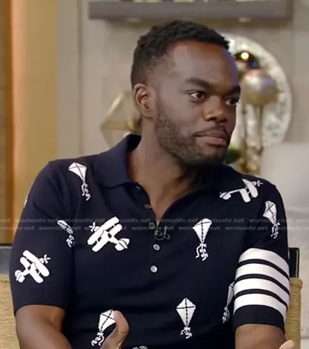 on Live with Kelly and Mark on Disney ABC Home Entertainment was spotted wearing this navy airplane print polo shirt on Live with Kelly and Ryan on Aug 08 2022's episode. 's Shirt is the Sky Icons Intarsia Polo Shirt by Thom Browne.
