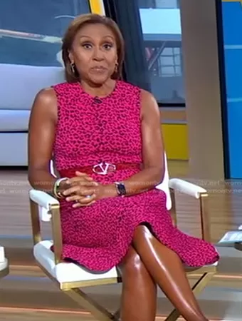 Robin Roberts on Good Morning America on ABC was spotted wearing this pink leopard dress on Good Morning America on Aug 08 2022's episode. Robin's Dress is the Sleeveless Jacquard Fit & Flare Dress by Adam Lippes.