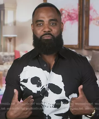 Todd Tucker on The Real Housewives of Atlanta on Bravo was spotted wearing this black skull print shirt on The Real Housewives of Atlanta on episode 'A Rum Punch to the Gut' (14x13) in Aug 2022. 's Shirt is the Skull Graphic Button-Up Shirt by Alexander McQueen.
