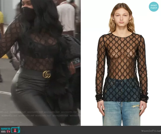 Marlo Hampton on The Real Housewives of Atlanta on Bravo was spotted wearing this Gucci logo sheer top on The Real Housewives of Atlanta on episode 'A Rum Punch to the Gut' (14x13) in Aug 2022. Marlo's Top is the Black Tulle GG Long Sleeve T-Shirt by Gucci.