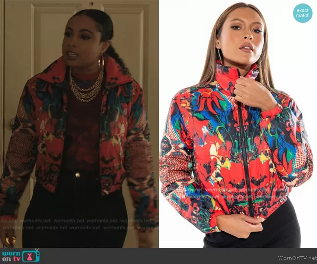 Tiffany (played by Hannaha Hall) on The Chi on ShowTime was spotted wearing this red printed bomber jacket on The Chi on episode 'Angels' (5x07) in Aug 2022. Tiffany's Jacket is the Printed Bomber Puffer Jacket by Akira.