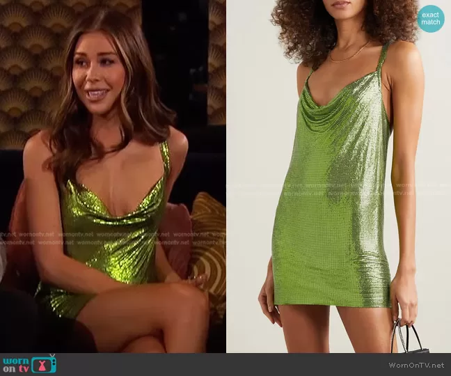 Gabriela Windey on The Bachelorette on ABC was spotted wearing this sequin cowl neck mini dress on The Bachelorette on episode 'Week 5' (19x05) in Aug 2022. Gabby's Dress is the Hailey Chainmail Mini Dress by Fannie Schiavoni . Gabby's Shoes is the Racy Mule Gold Stiletto Heel Sandals by Jessica Rich.