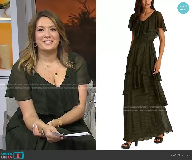 on Today on NBC was spotted wearing this green zebra print ruffle dress on Today on Aug 09 2022's episode. 's Dress is the Zebra-Print Chiffon Gown by Ralph Lauren.