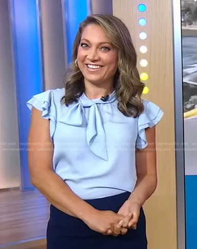 Ginger Zee on Good Morning America on ABC was spotted wearing this blue ruffle tie neck top on Good Morning America on Aug 09 2022's episode.