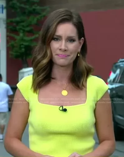 Rebecca Jarvis on Good Morning America on ABC was spotted wearing this yellow ribbed square neck top on Good Morning America on Aug 10 2022's episode. Rebecca's Top is the Contour Top by Helmut Lang.